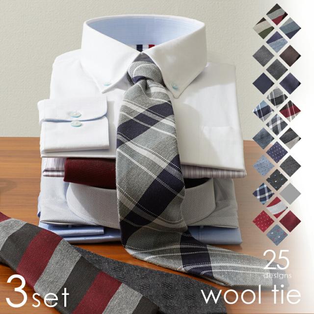 選べる3本セット ウールネクタイ 秋冬用 アクリルビジネス 無地 おしゃれ 結婚式 ブランド 全20柄 レギュラー ストライプ チェック ドット グレー ネイビー ワイン レッド ブラウン 父の日
