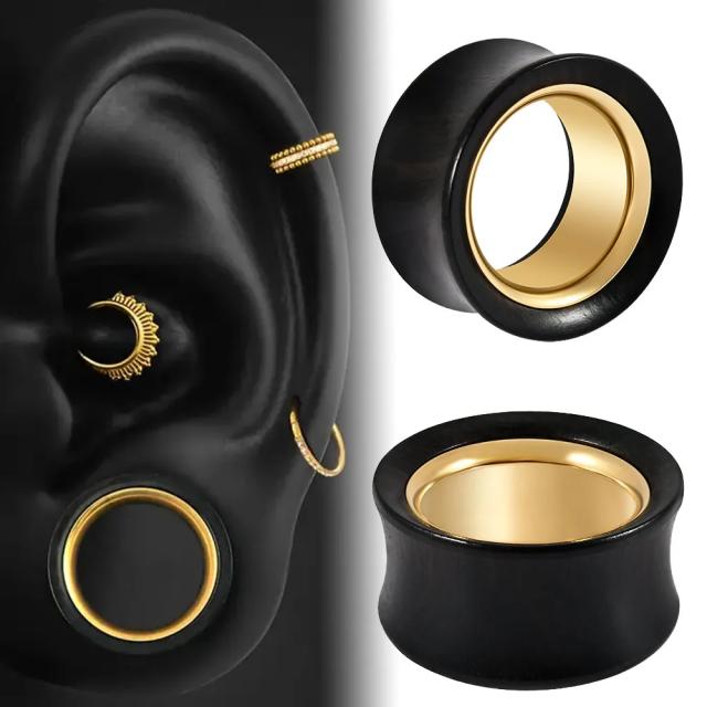 [木製xステンレス 0G 00G 12mm ボディピアス] ゴールドブラックダブルカラーフレア 1個販売 トンネル ダブルフレア ボディーピアス 0ゲージ 8mm 00ゲージ 10mm 12.0mm 12ミリ 1/2インチ ハーフ 黒色 金色 穴 シンプル ホール系 メンズ レディース サージカルステンレス316L