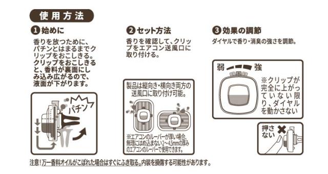 (2)セット方法:香りを確認して、クリップをエアコン送風口に取り付ける。
