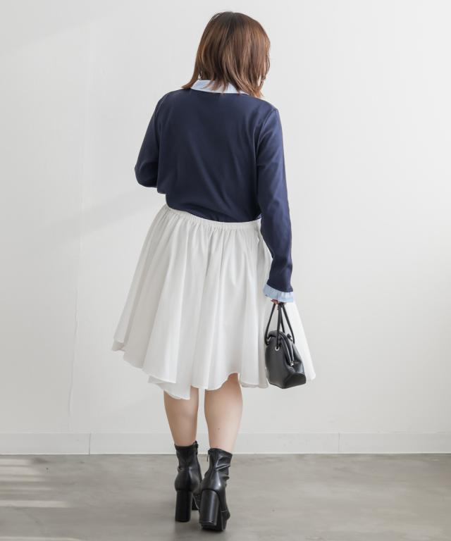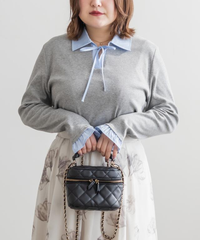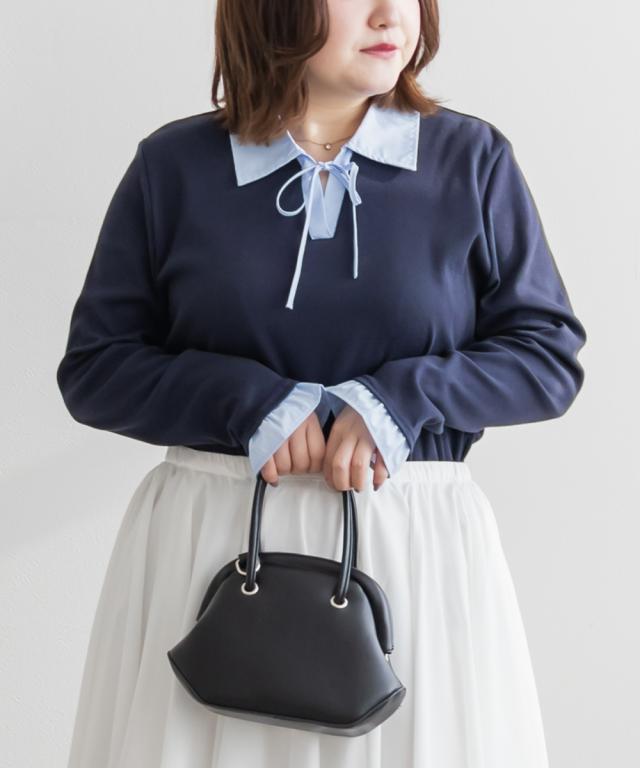 | 3Lサイズを着用して程よいサイズ感でした。フィット感がありつつ伸縮性のあるリブカットソー生地なので窮屈感無く着られます!シャツを重ねたようなドッキングデザインが一枚でスタイリングを完成させてくれる優秀トップスで、 着丈が長すぎず裾出しで着て可愛い1枚です♪襟もとはリボンがついていてガーリーな雰囲気になります!デニムや可愛いスカートにも相性良く着られます◎ |