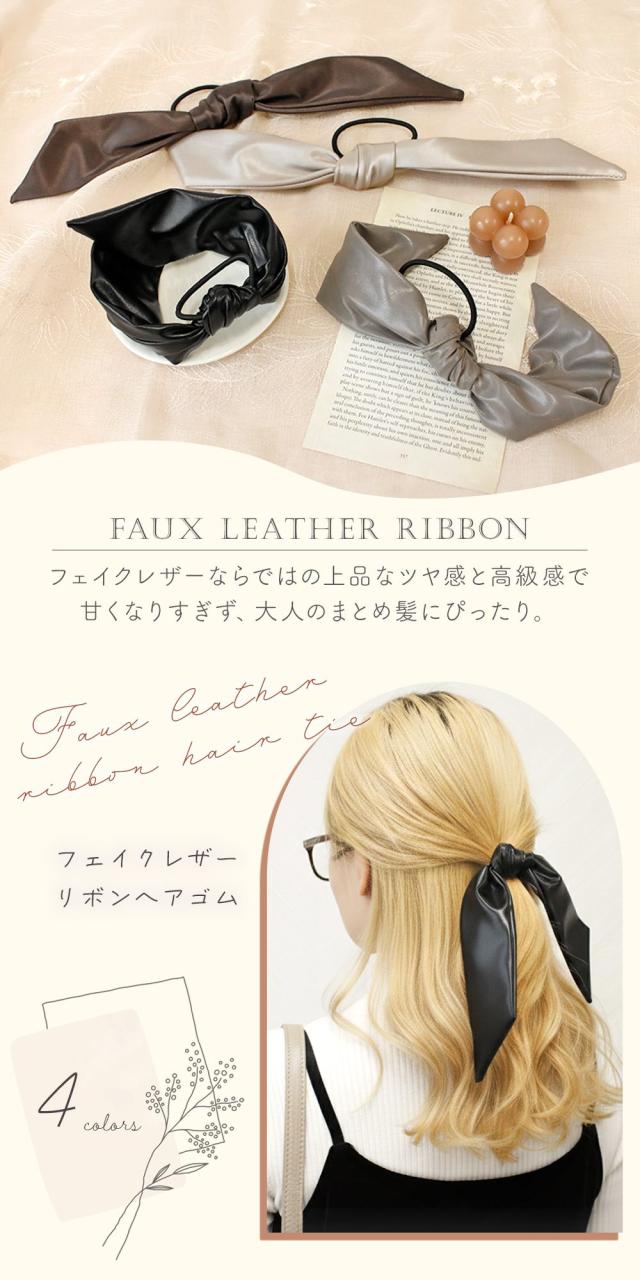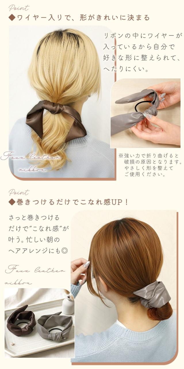 リボン/ヘアゴム/フェイクレザー/PUレザー/ワイヤー/髪留め/上品/高見え/形状変更/ポニーテール/巻き付け/ツヤ感/高級感/おしゃれ/可愛い/レディース/まとめ髪/ヘアアレンジ/こなれ感/光沢/フォーマル/ローポニー/ハーフアップ/黒/大人/髪/レザー調/髪飾り/ヘアアクセ/シック/シンプル/大人っぽい/簡単/普段使い/ヘアアクセサリ/ポニーフック/セレモニー/入学式/卒業式/