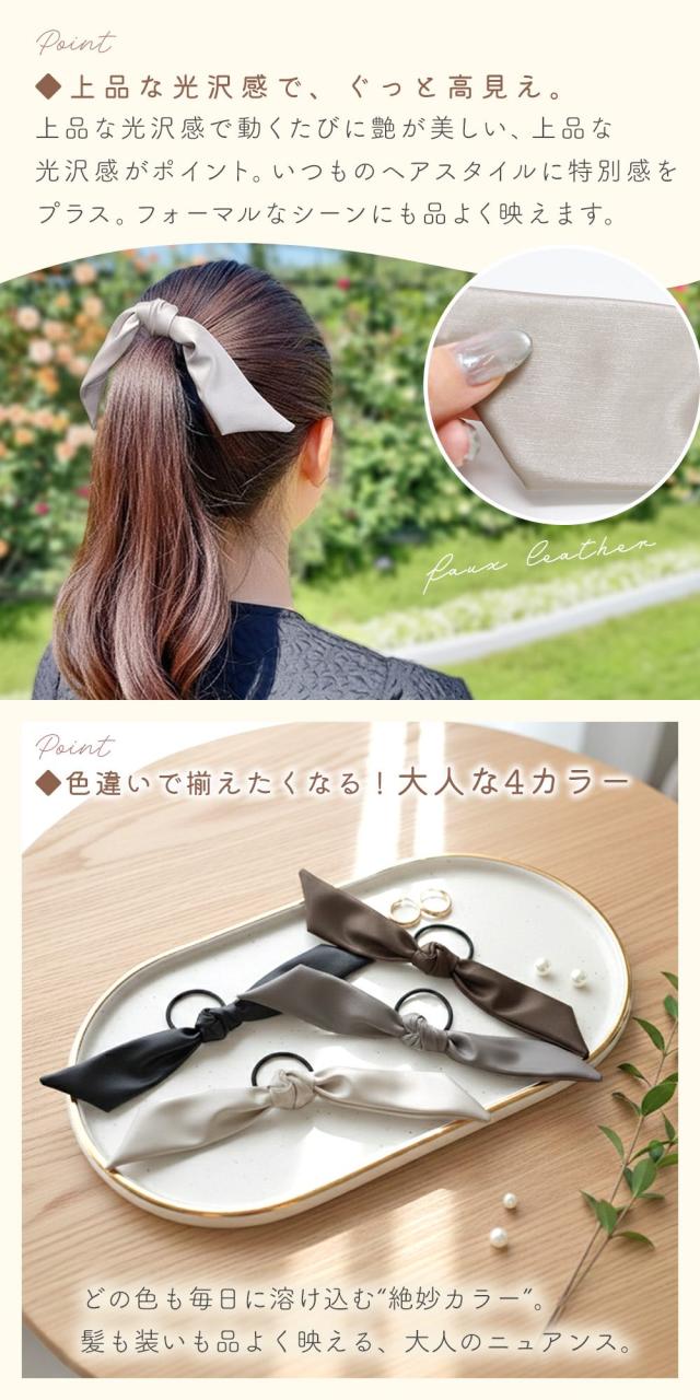 レザー調の素材感とツヤ感が程よいアクセントになり、シンプルな装いにも上品にフィット。ほどよい存在感で主張しすぎず、通勤やお出かけなどの普段使いから、入学式・卒業式などのセレモニーまで幅広いシーンで使いやすいヘアアクセサリです。