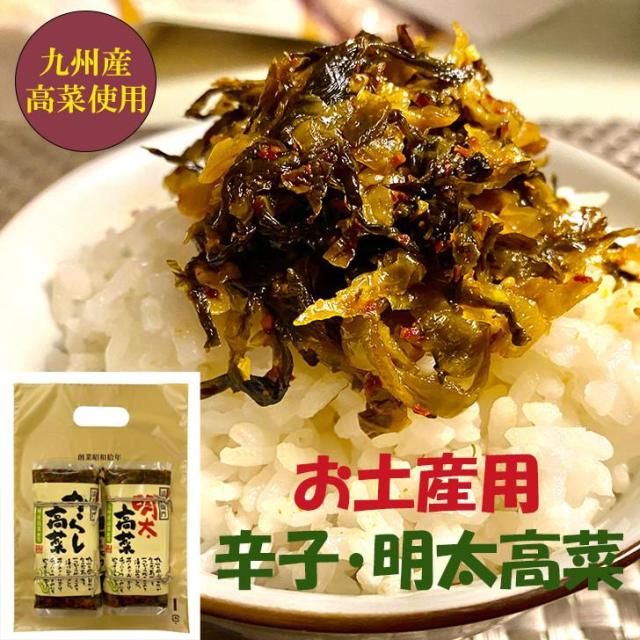 九州産の刻み高菜を丁寧に油炒めし、唐辛子で味付けした当店自慢の看板商品です。