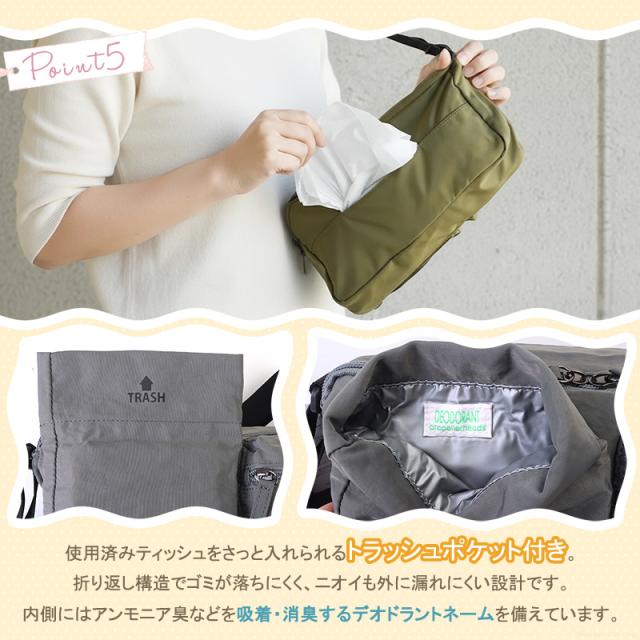 【仕様】メイン収納×1(ダブルファスナー2ヶ所)、前面ファスナーポケット×1、ソフトティッシュポケット×1、トラッシュポケット×1、デオドラントネーム付き