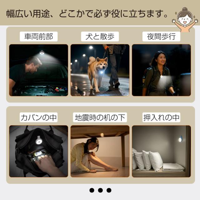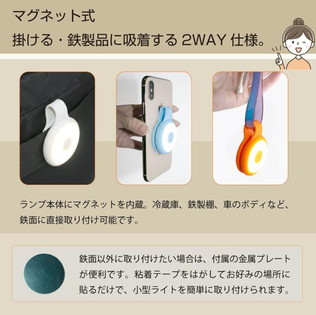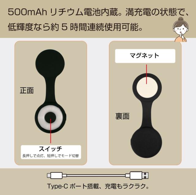 マグネットストラップが付いたUSB充電式のミニLEDライトです。 イロイロな場所に 貼る、挟む、掛ける ことができます! |