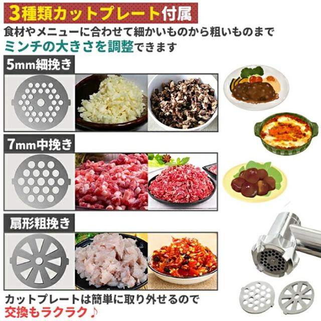 5mm細挽き、7mm中型、扇形粗挽きの3種類カットプレート付き!食材やメニューに合わせて細かいものから粗いものまで選べて、ミンチの大きさを調整できます。カットプレートは簡単に取り外しでき、交換も楽にできます。