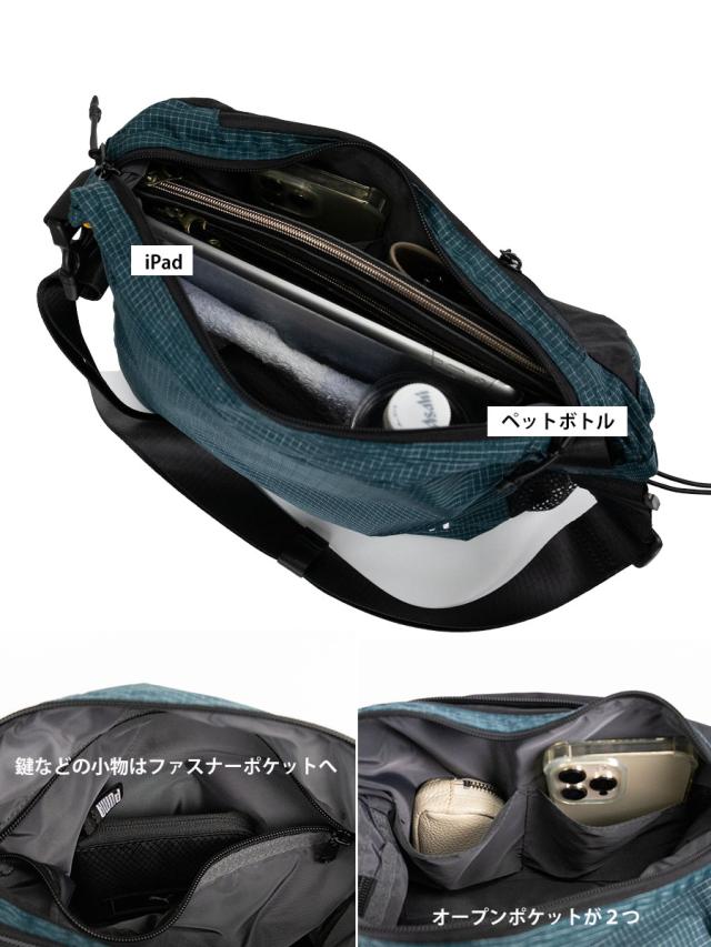 iPadが入るB5サイズ。貴重品以外の外出に持ち歩きたいアイテムが程よく収まるトラベル等にもおすすめのサイズです。わずか約284gと超軽量で側面にスマホが入るポケットとペットボトルが収まるポケットがあり機能的です。