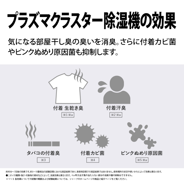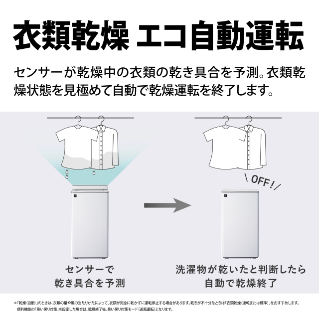 ※2 除湿機の衣類乾燥性能は一般社団法人日本電機工業会 自主基準(JEMA-HD090:2017)に基づき、以下の条件のもとで試験を行った値です。試験条件●部屋の広さ6畳相当●室温20℃、湿度70%、60Hz●洗濯物:2kg相当(Tシャツ3枚、Yシャツ2枚、パジャマ1組、下着7枚、靴下2足、タオル3枚)●製品位置:洗濯物の下方、外周近傍に設置●運転モード:衣類乾燥「速乾」運転時。実使用時の衣類乾燥時間は使用環境・使用条件により異なります。