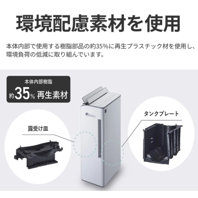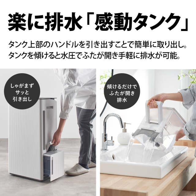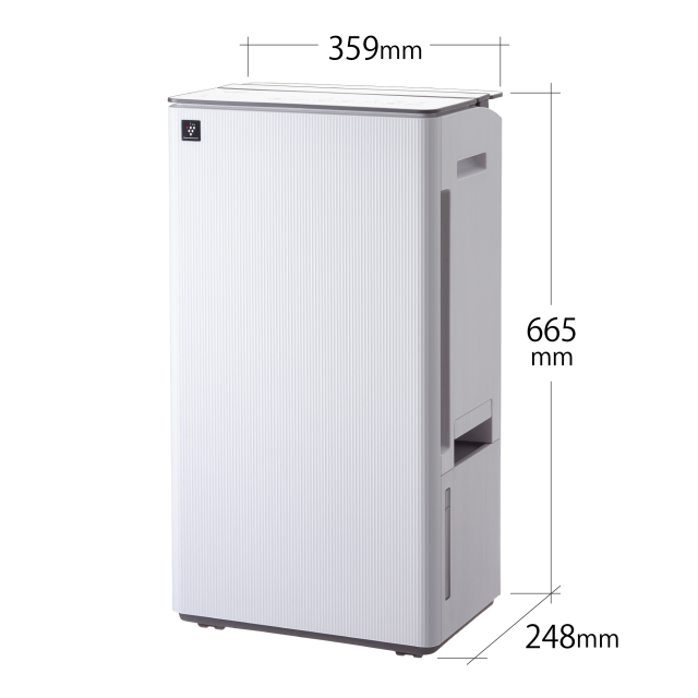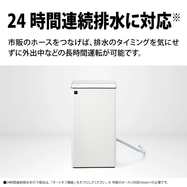 切(1-9時間)キャスター 4輪(自在) フィルター ホコリブロックプレフィルター チャイルドロック ● 排水タンク容量 約4.5L(感動タンク) 連続排水 ●(市販のホース<内径15mm>が必要) 使用可能温度 4〜38℃ 外形寸法(mm) 幅359×奥行248×高さ665 質量(kg) 約16.9 ※ ※1 除湿「強」運転時。室温27℃、相対湿度60%を維持し続けたときの1日あたりの除湿量。