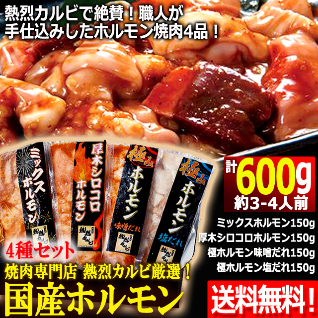 焼肉専門店熱烈カルビ厳選!国産ホルモン4種セット計600g グルメ 牛 ミックスホルモン 厚木シロコロホルモン 極ホルモン味噌だれ 極ホルモン塩だれ