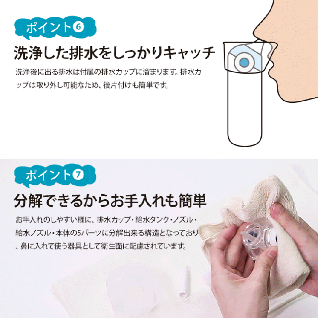 | 備考 | 以下の人は使用しないでください。 ・内耳と耳膜手術、口腔咽頭部損傷または外科手術を受けた時 ・中耳炎にかかっている ・風邪を引くなどして鼻が詰まっている、また鼻を充分にかめない場合 ・鼻や耳に出血・外傷・外耳炎等の疾患がある、または鼻の粘膜が弱い方 ・礫下障害がある ・塩化ナトリウム代謝障害がある場合 ・自分で意思表示ができない人や、自分で操作できない人だけで使用させない ・乳幼児や7歳未満の子供には使用させない 子供(7歳以上)が使用する場合は必ず大人が付き添い、目を離さない ・子供の手が届くところに置かない ・鼻腔内の洗浄以外の目的に使用しない ・耳鼻科および眼科の疾患のある方や過去にあった方は、専門の医師に相談の上使用する |