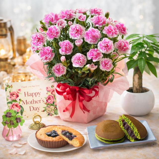 母の日 早割 プレゼント 2026 花とセット ギフト カーネーション ティーパーティ 鉢植え 選べる特典付き パキラ 抹茶どら焼き ブルーベリーマドレーヌ 四葉のクローバー球根 カレンダー付き 園芸専門店 吉本花城園
