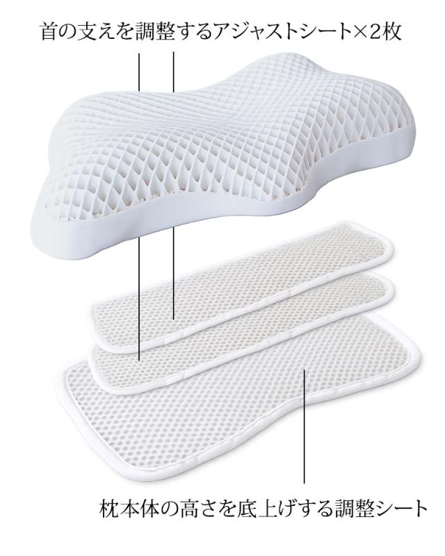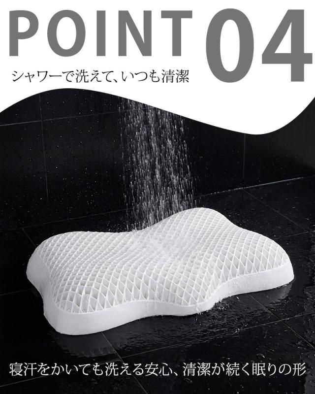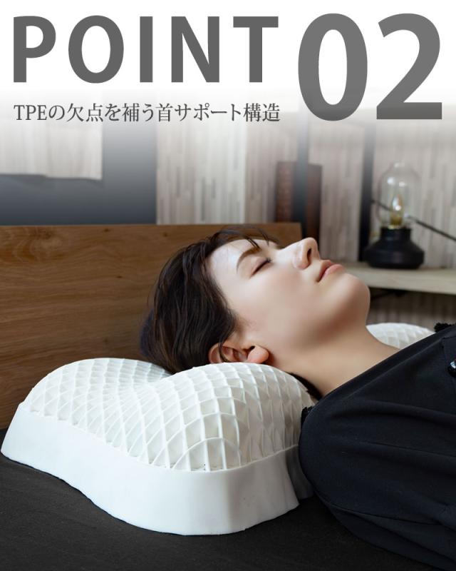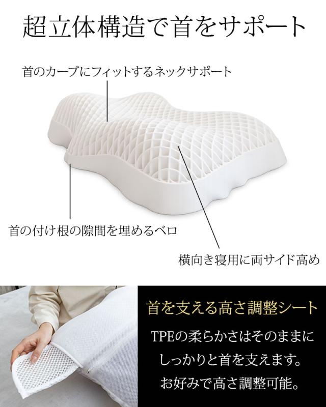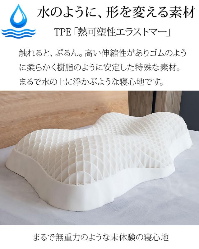 ■新素材TPEによる無重力体験 ぷるぷるとした弾力のある新素材「TPE」と網目構造が、頭の重さを瞬時に分散。優れた体圧分散性により、まるで宙に浮いているような心地よいフィット感を実現します。 ■首を支える超立体構造 頸椎のカーブに自然に沿う3D立体構造で、理想的な寝姿勢をしっかりサポート。付属のシートで自分好みの高さに微調整できるため、仰向けでも横向きでも快適に眠れます。 ■丸洗いできる圧倒的な清潔さ 格子状のオープン構造が熱や湿気を効率よく逃がし、睡眠中の蒸れを解消。枕本体をシャワーで直接丸洗いできるため、汗やニオイ、ダニを気にせず常に清潔を保てます。 |