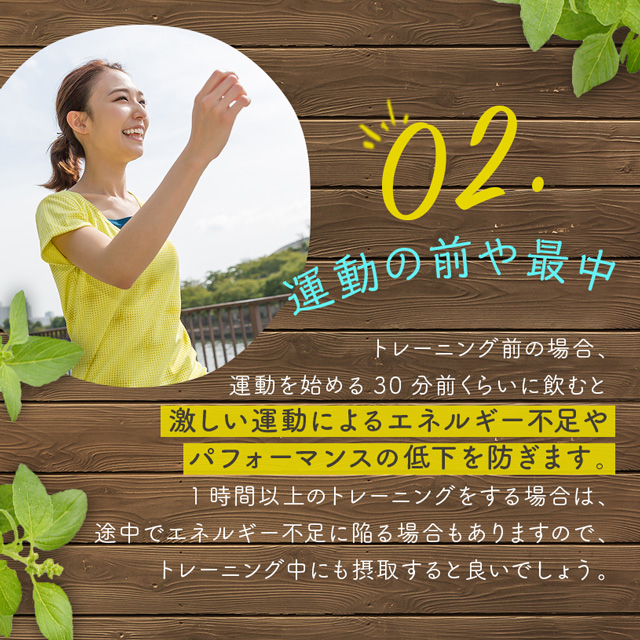 水、ジュース スポーツドリンク、アミノ酸系ドリンクやプロテインなどに入れて一緒にお召し上がりください。 【このような方に】 ・筋肉をつける目的で筋力トレーニングをしている方 ・運動パフォーマンスを向上させたい方 ・集中力を必要とする勉強(記憶、集中、思考)等を行っている方 ・ハードなスポーツや運動等を行っている方 |