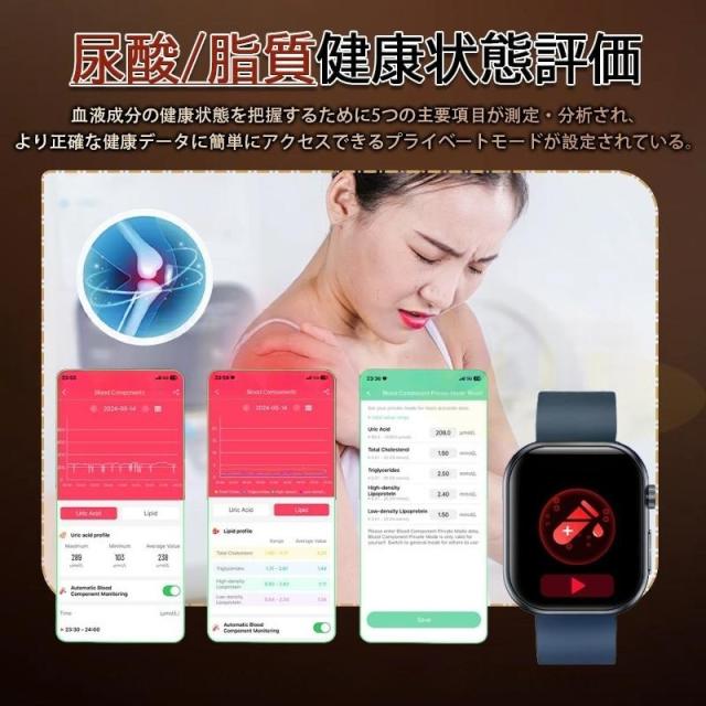 ●24H管理:体組成分析、マイクロ検診機能、HRV検査、情緒検査、疲労度検査、血液成分測定(尿酸血脂機能)、体組成、体脂質、血中酸素モニタリング、血圧モニタリング、BMI測定、心拍数モニタリング、体温、睡眠などの測定機能付き