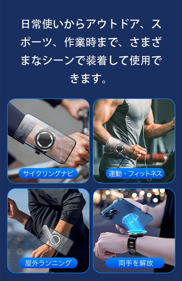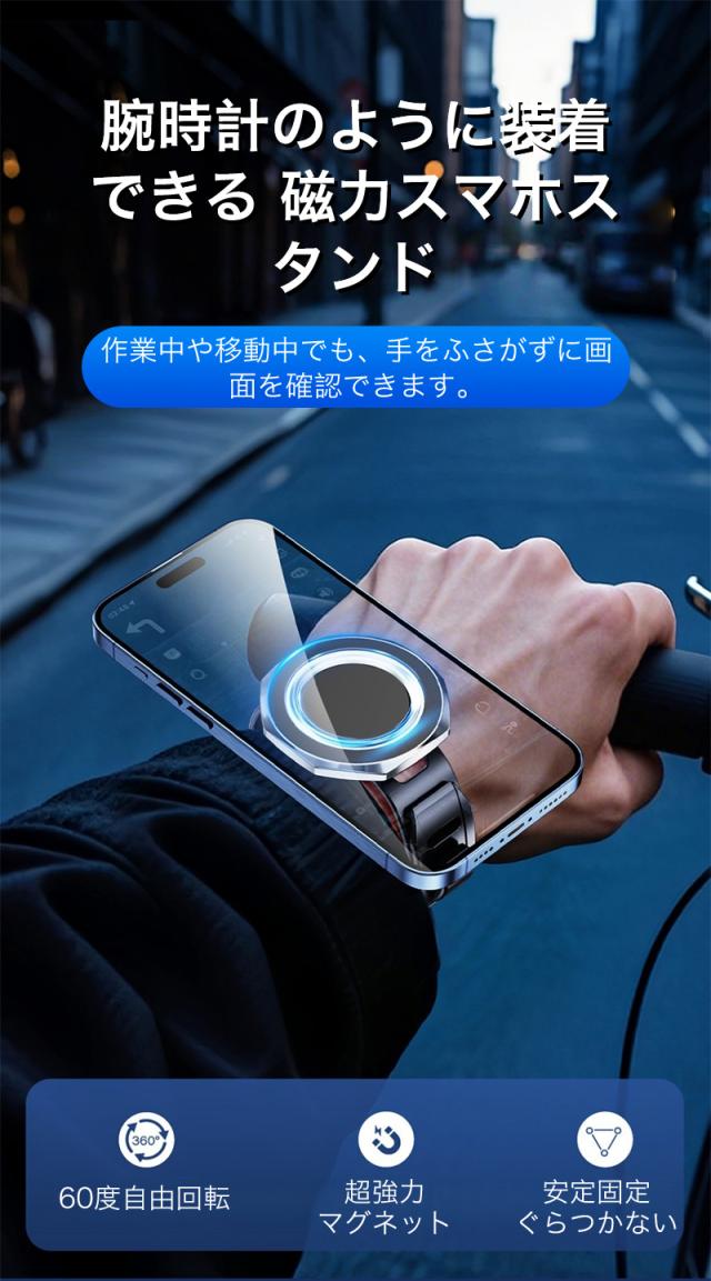 スマホホルダー 手首 バンド MagSafe スマホスタンド 腕時計式 シリコン素材 マグネット式 横置き 縦置き 360度回転 安定固定 サイクリング スポーツ 便利