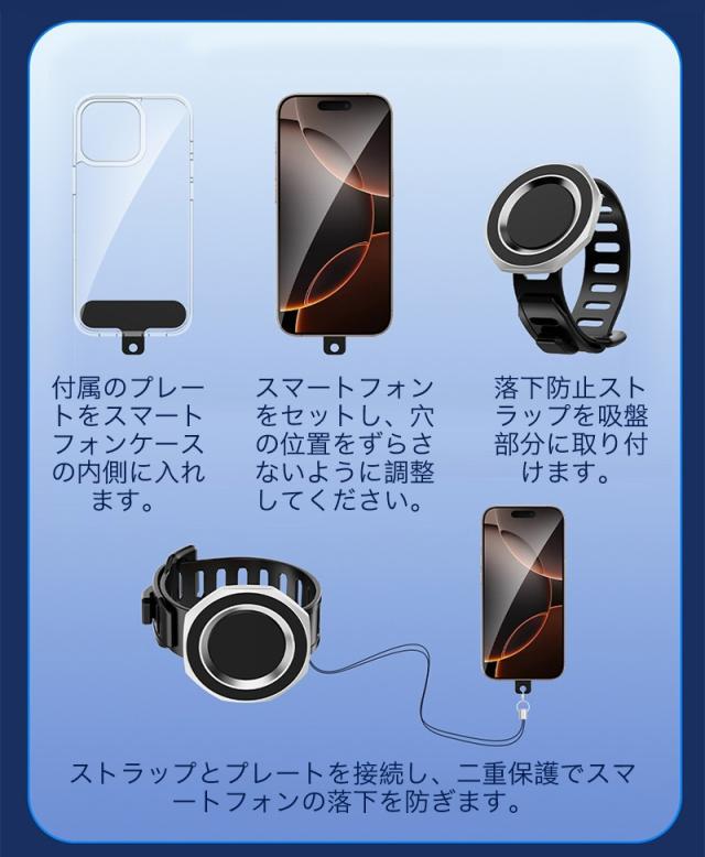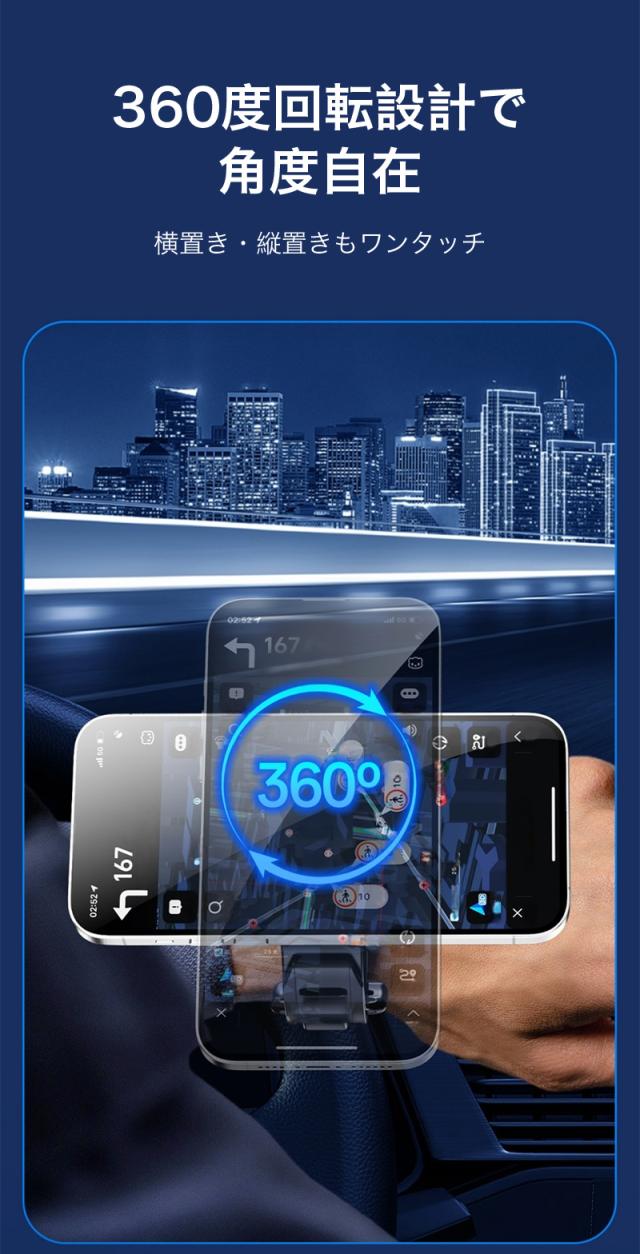 強力な磁石でスマートフォンをしっかり吸着し、使用中にずれたり外れたりしにくい設計です。