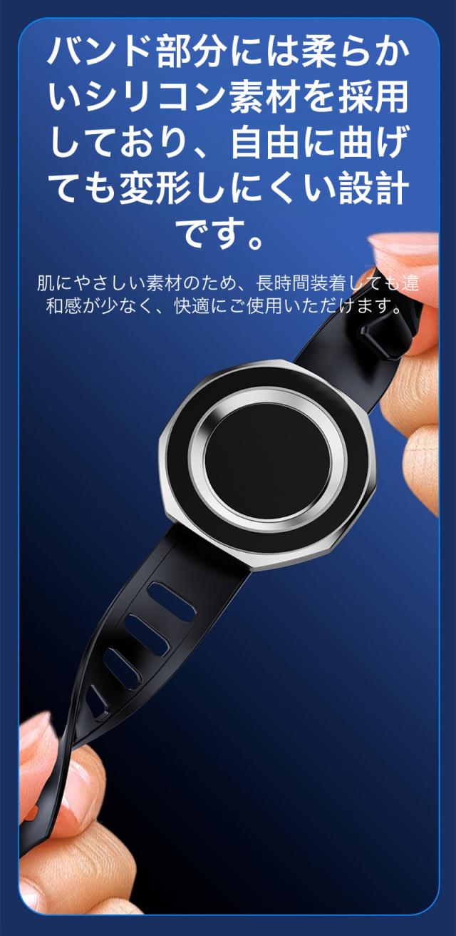 バンド部分には柔らかいシリコン素材を採用しており、自由に曲げても変形しにくい設計です。
