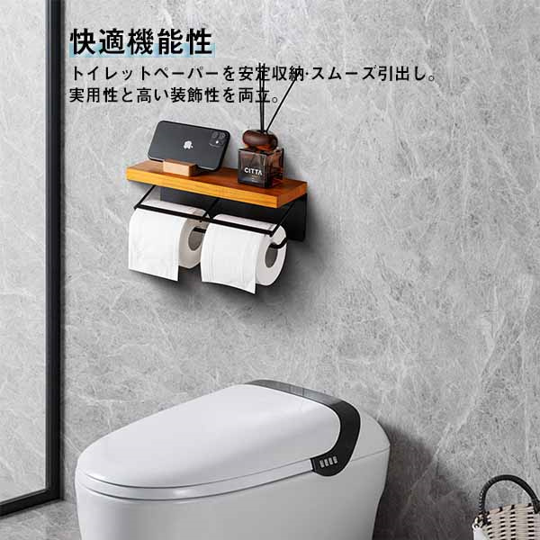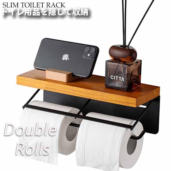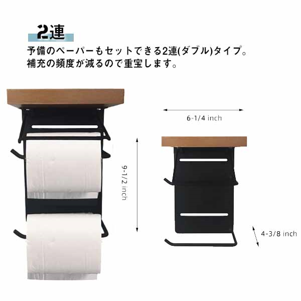 トイレットペーパーホルダー 2連 おしゃれ ダブル カバー 天板付き 木製 棚 アイアン 北欧 木製カバー シンプル モダン パイン ブラウン