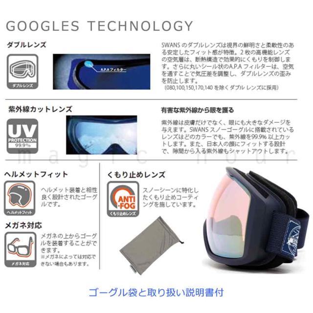 日本設計の安心のブランドSWANSの眼鏡対応スノーゴーグル♪球面ミラーレンズ! ダブルレンズ+くもりどめコーティングでクリアな視界を確保!♪ ベーシックで使いやすいシンプルな形状、メガネ対応の大型レンズで快適♪ くもり止め加工 / ダブルレンズ / UVカット99.9% / ヘルメット対応 / めがね対応 / 撥水特殊コーディング / ゴーグルバック付属 |