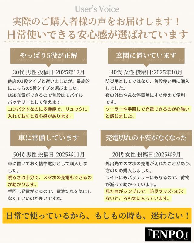 多くの防災グッズは、押し入れの奥で電池が切れたまま放置されています。私たちは「日常で使い倒せることこそが、もしもの時の安心に繋がる」と考えました。ENPOはわずか116g。カラビナ一体型なので、普段はリュックや夜道の散歩に、非常時は命を繋ぐ明かりとスマホ充電器に。ラジオをあえて省き、軽量さとタフさを追求した「持ち歩ける安心」の自信作です。