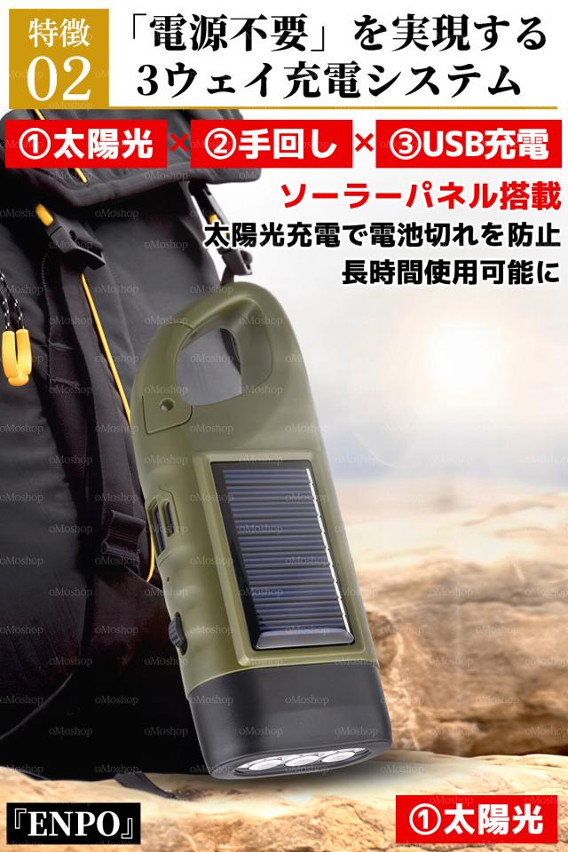 1.【3WAY充電】USB・ソーラー・手回し発電。どんな状況でも明かりが灯る