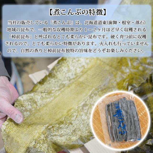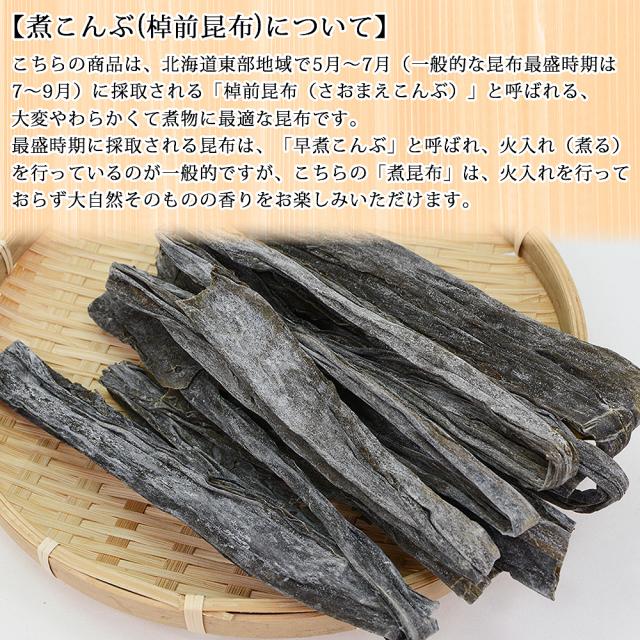 最盛時期に採取される昆布は、「早煮こんぶ」と呼ばれ、火入れ(煮る)を行っているのが一般的ですが、こちらの「煮昆布」は、火入れを行っておらず大自然そのものの香りをお楽しみいただけます。