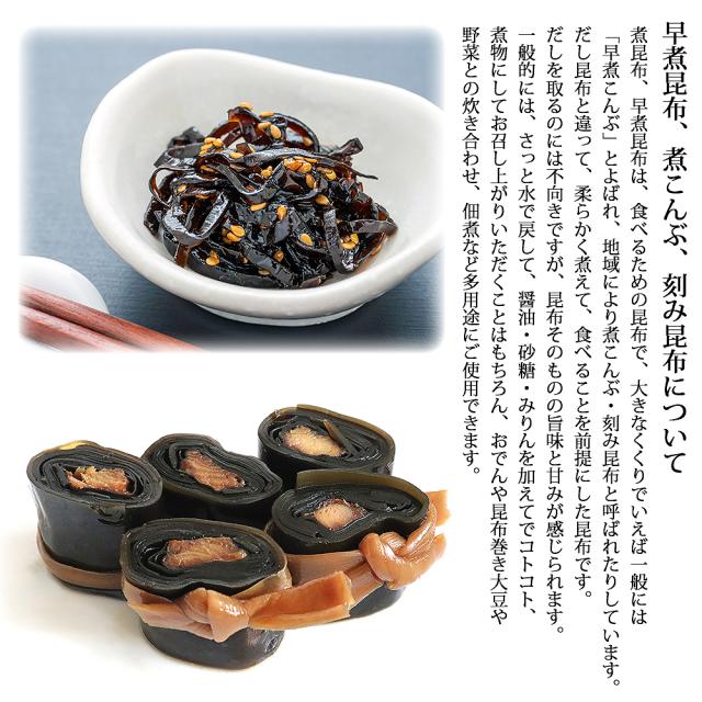 煮昆布、早煮昆布は、食べるための昆布で、大きなくくりでいえば一般には「早煮こんぶ」とよばれ、地域により煮こんぶ・刻み昆布と呼ばれたりしています。