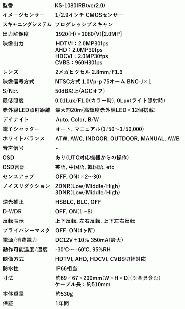 【※姉妹品に、2.8mmレンズ搭載マイク内蔵ドーム型モデル[KS-1080IRDA(Vision E)]もございます】