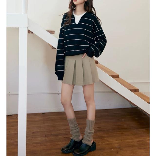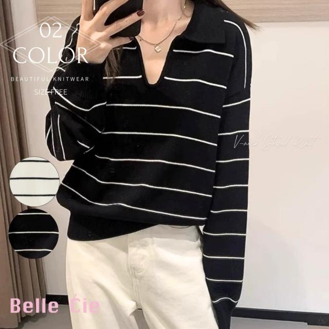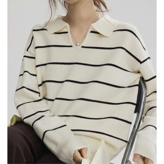 ニット トップス ボーダー Vネック 薄手 襟付き 長袖 ゆったり レディース 韓国ファッション 大人見え きれいめ 大人可愛い シンプル 通勤 柄