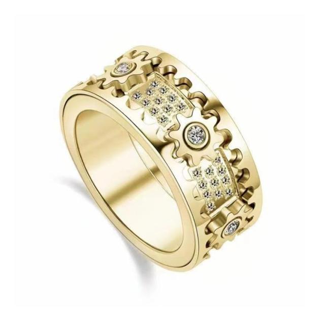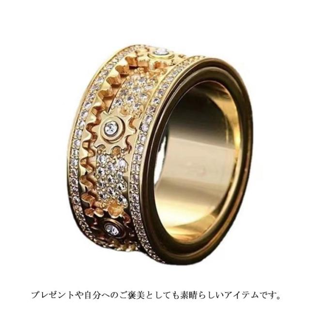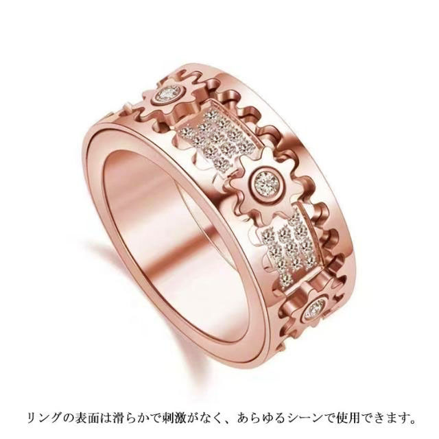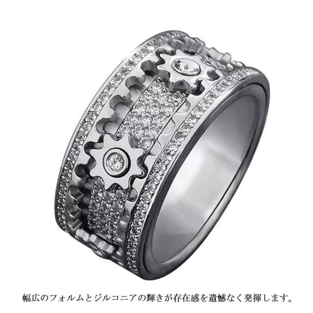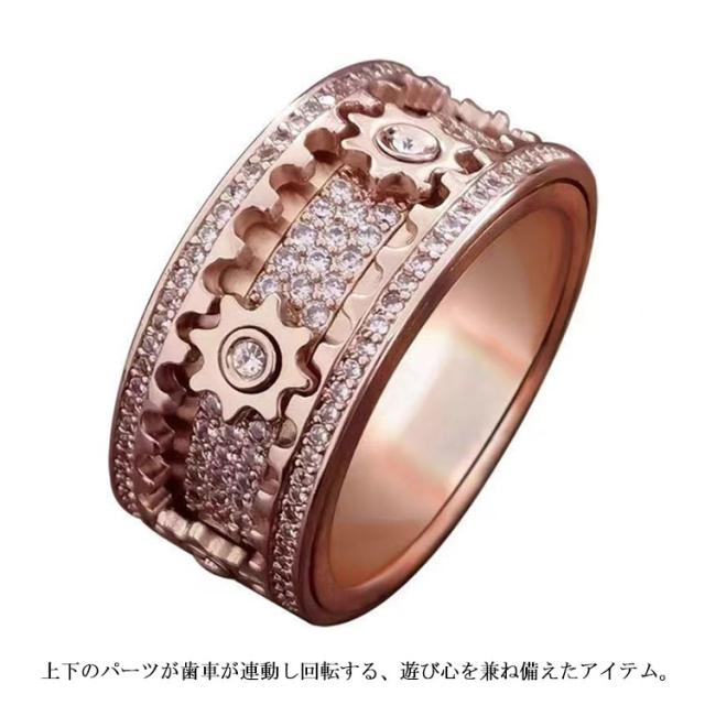 | くるくるまわるリング。 幅広のフォルムとジルコニアの輝きが存在感を遺憾なく発揮します。 上下のパーツが歯車が連動し回転する、遊び心を兼ね備えたアイテム。 高品質な素材を使用しており、長時間の着用でも快適です。リングの表面は滑らかで刺激がなく、あらゆるシーンで使用できます。 プレゼントや自分へのご褒美としても素晴らしいアイテムです。 | |