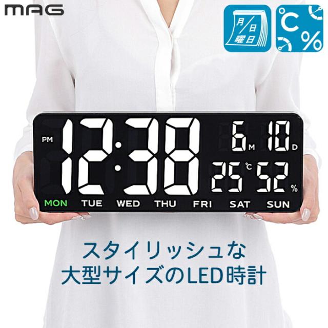LEDデジタル時計 大型 壁掛け 置き時計 MAG ホワイトアワー デジタルクロック 見やすい 温度計 湿度計 カレンダー おしゃれ スタイリッシュ USB給電 ACアダプター付 35cm ワイド 熱中症対策 オフィス リビング 店舗 介護 老人ホーム 新生活 プレゼント 【選べる特典付】
