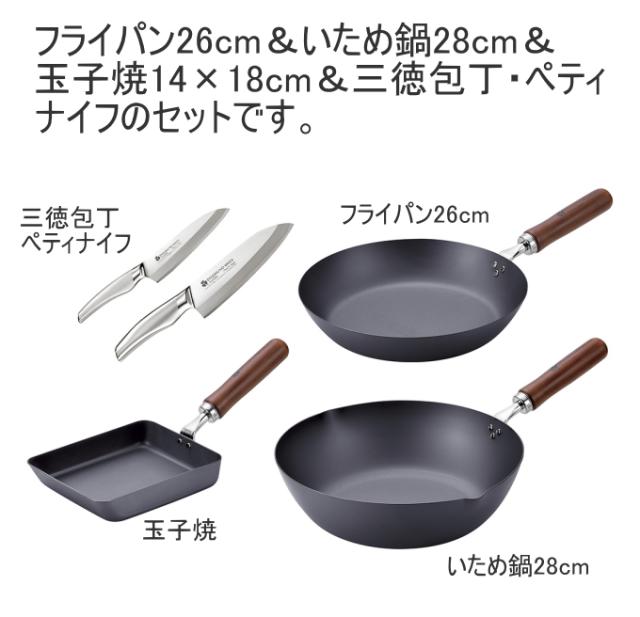 燕熟の技 クローバー 窒化シリーズ フライパン26cm&いため鍋28cm&玉子焼14×18cm&三徳包丁・ペティ2本セット CTT-5000 日本製 鉄製 さびにくい 丈夫 フライパン 玉子焼 5点セット IH対応 ガス火OK よこやま 新潟県燕市