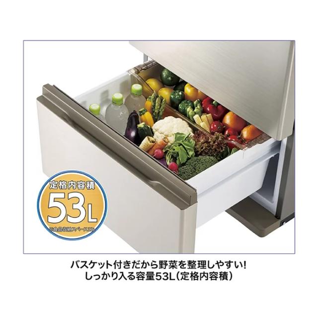 シンプル&スタイリッシュデザイン 大容量の2ドアまん中大容量フリーザー インバーター採用で省エネモデル ■全内容積 262L ■冷蔵室内容積 135L<112L> ■内チルドルーム 17L ■野菜室 53L<32L> ■冷凍室 74L<43L> ■外形寸法 幅600mm×高さ1375mm×奥行685mm※1 ※1:奥行はキックプレートを除く ■据付必要奥行寸法 701mm(キックプレート含む) ■年間消費電力量(50Hz/60Hz) 247/247kWh/年 ■製品質量 59kg 定格内容積<>内は食品収納スペースの目安 ※記載は商品仕様の一部です。仕様説明不足等の理由での返品はできません。特に適合等は必ずご確認ください。