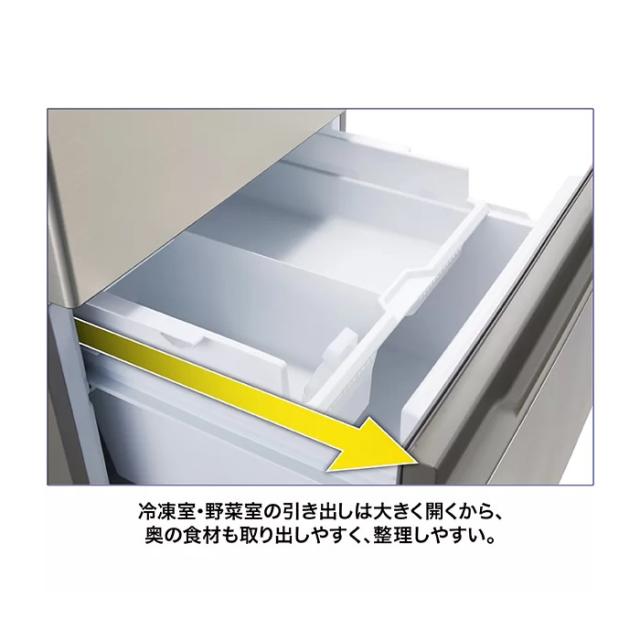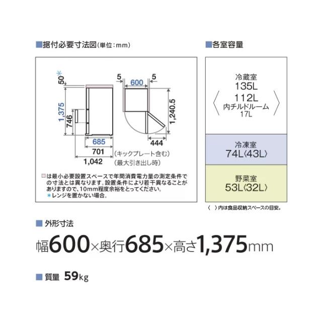 シンプル&スタイリッシュデザイン 大容量の2ドアまん中大容量フリーザー インバーター採用で省エネモデル ■全内容積 262L ■冷蔵室内容積 135L<112L> ■内チルドルーム 17L ■野菜室 53L<32L> ■冷凍室 74L<43L> ■外形寸法 幅600mm×高さ1375mm×奥行685mm※1 ※1:奥行はキックプレートを除く ■据付必要奥行寸法 701mm(キックプレート含む) ■年間消費電力量(50Hz/60Hz) 247/247kWh/年 ■製品質量 59kg 定格内容積<>内は食品収納スペースの目安 ※記載は商品仕様の一部です。仕様説明不足等の理由での返品はできません。特に適合等は必ずご確認ください。