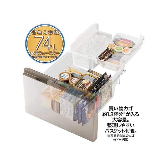 ●バスケット付き74L(定格内容積)大容量冷凍室