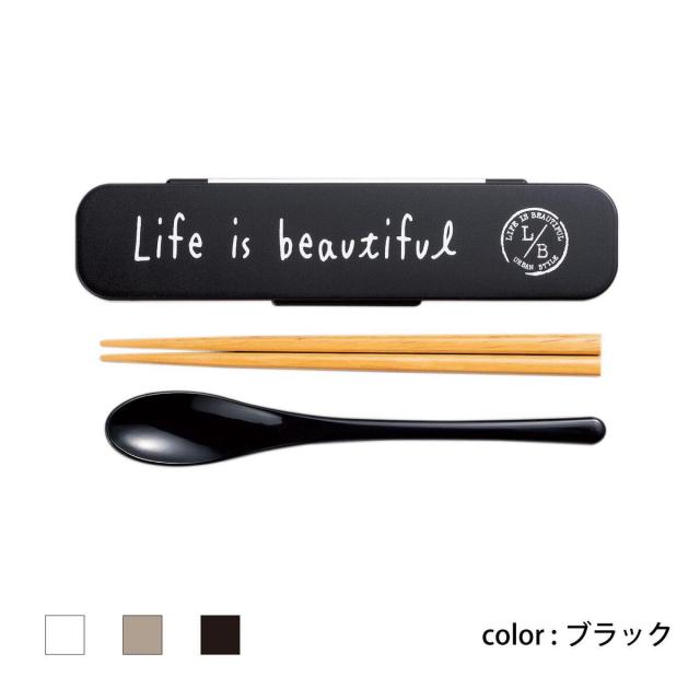 日本製 コンビセット 箸 スプーン 18cm LIFE IS BEAUTIFUL スタンプ ブラック(代引不可)