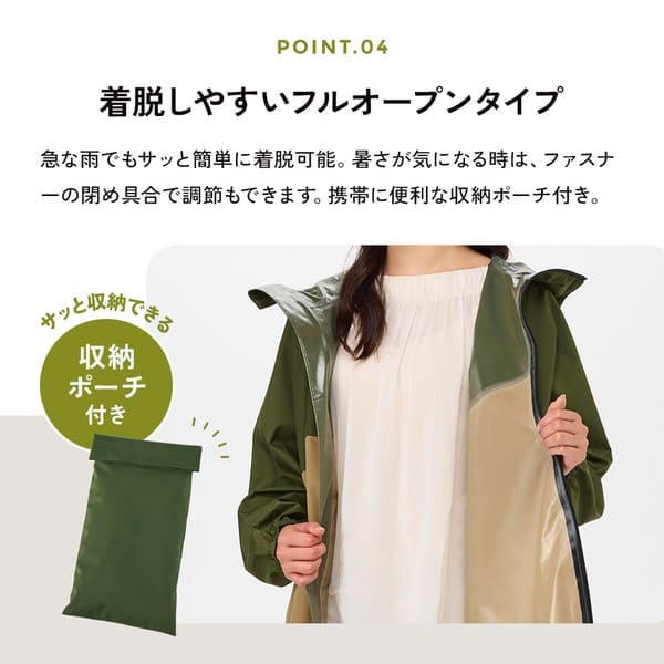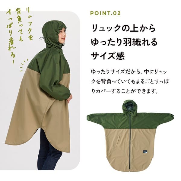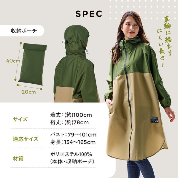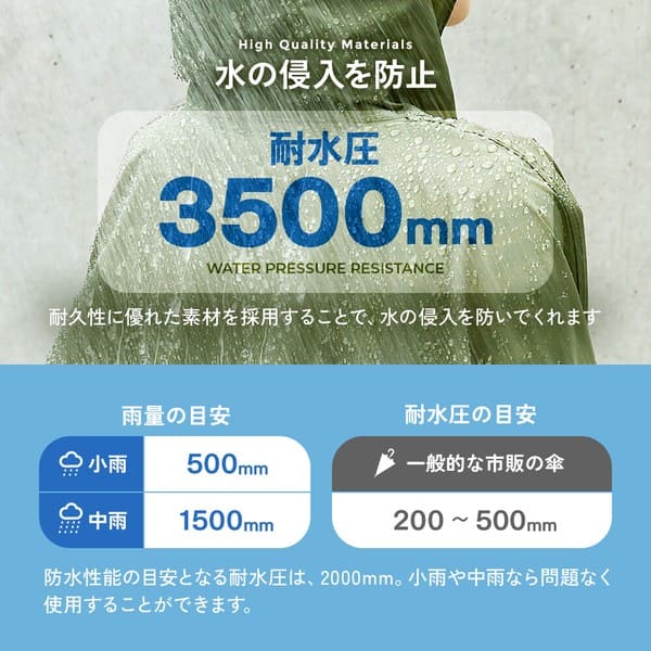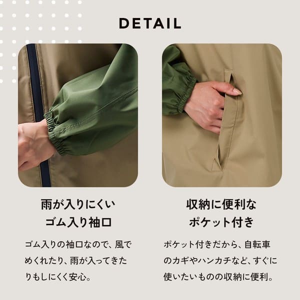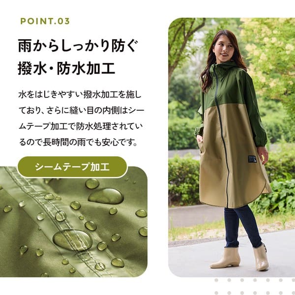 ●火気や高温のそばに近づけないでください。●本品は防水性(耐水圧3,500mm以上)を備えておりますが、透湿性はありません。着用中にムレを感じる場合があります。お肌にかゆみや不快感などを感じた場合は、すぐに使用を中止してください。●表面に撥水(水をはじきやすい)加工、内側の縫製部には防水テープを使用しておりますが、豪雨時や長時間の使用は雨が染み込む恐れがありますので避けてください。●使用を繰り返すことで撥水効果は徐々に低下します。●着用時に強い摩擦を受けると他のものに色移りする恐れがあります。万が一、色移りした場合は早めに洗濯してください。
