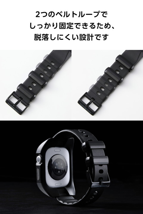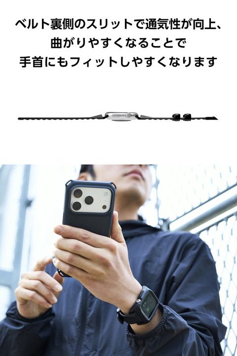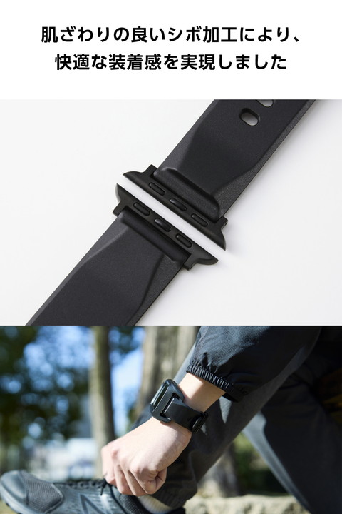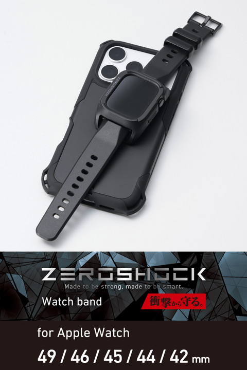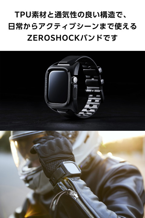 弾力性があり傷や汚れにも強いTPU(熱可塑性ポリウレタン)素材と、通気性の良い構造で手首にフィットし、日常からアクティブシーンまで快適に使えるApple Watch用ZEROSHOCKバンドです。