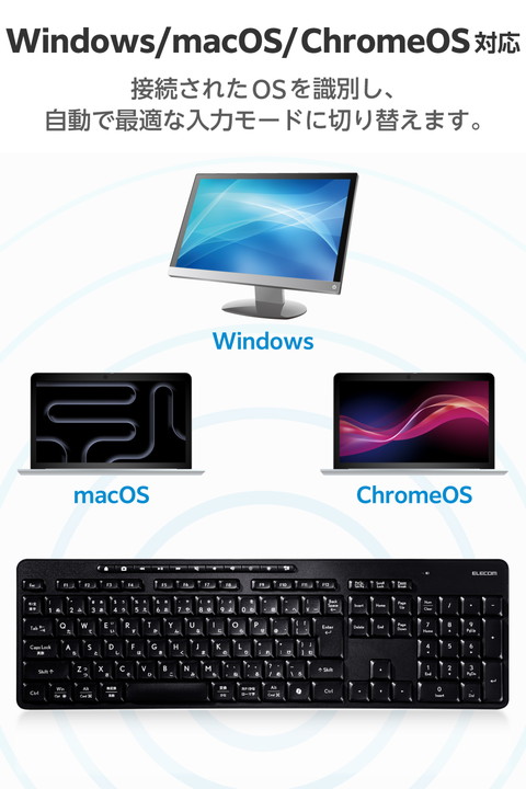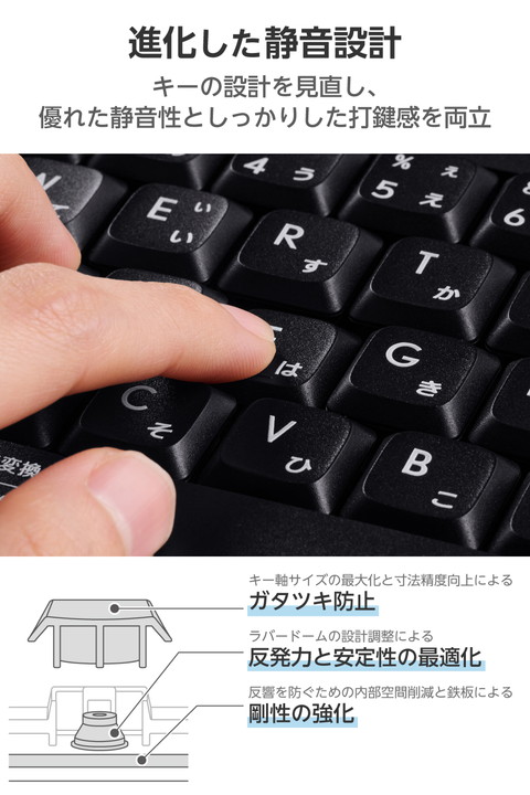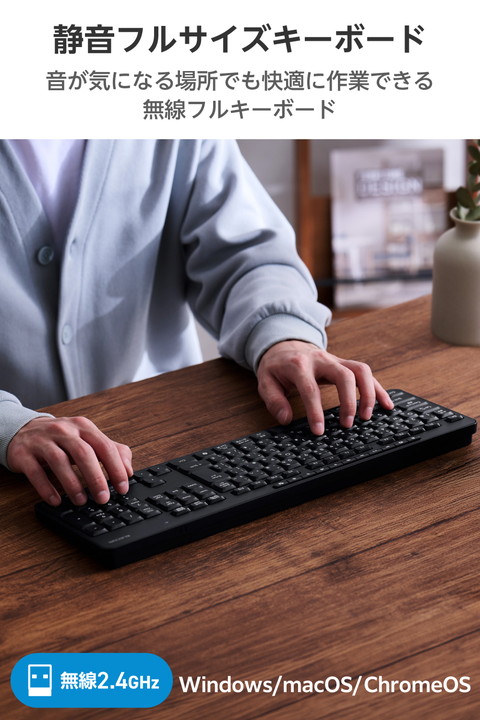 進化した静音設計!さまざまなOSと接続でき、音が気になる場所でも快適に作業できる無線2.4GHzフルキーボードです。
