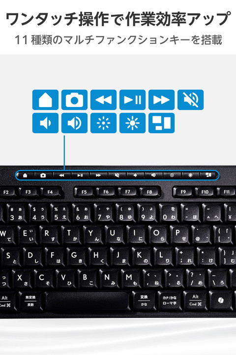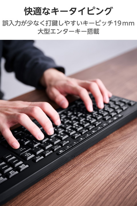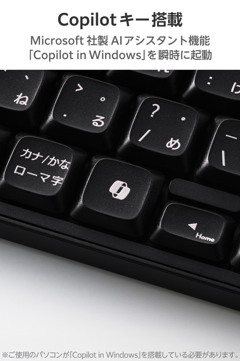 進化した静音設計!さまざまなOSと接続でき、音が気になる場所でも快適に作業できる無線2.4GHzフルキーボードです。![]() ■数字入力に便利なテンキー付きキーボードです。データ入力や集計などさまざまな作業を効率化できます。 ■キーの軸、内部空間、ラバーなどあらゆる要素の設計を見直し、優れた静音性としっかりとした打鍵感を両立しました。 ■Windows/macOS/ ChromeOS に対応。接続されたOSを識別し、自動で最適な入力モードに切り替えます。 ■誤って水などの液体をキーボード上にこぼしても、本体背面の水抜き穴からすばやく排出できる排水機構を採用しています。 ■※防水設計ではありません。 ■メディアプレーヤーの起動、音量や明るさの調整などをワンタッチで実行できる独立した11種類のマルチファンクションキーを搭載しています。 ■キートップをラバードームで支える“メンブレン方式”を採用しています。 ■機能性に優れ、効率的な入力作業を実現するテンキー搭載のフルサイズです。 ■パソコンのUSBポートにレシーバーユニットを挿すだけで、すぐに使用することができます。専用ドライバーなどのインストールは不要です。 ■スペースキー列の右側にCopilotキーを搭載。Microsoft社製AIアシスタント機能「Copilot in Windows」を瞬時に起動できます。 ■※ご使用のパソコンが「Copilot in Windows」を搭載している必要があります。 ■大型のエンターキーや、独立して配置されたDelete、Insertなどの特殊キーにより、誤入力しにくく快適なキータイピングが行えます。また、打鍵しやすいキーピッチ19mmで快適なタイピングが可能です。 ■姿勢に合わせて傾斜角を2段階で調整できる角度調整スタンドを搭載し、スタンドの底面にはキータッチを安定させる滑り止めも備えています。 ■電源スイッチがあり、不使用時の電池の消耗を防止できます。また、電源ON、電池交換などを知らせるLEDランプが付いています。 ■単4電池2本で動く電池交換式キーボードです。 ■自社環境認定基準を1つ以上満たし、『THINK ECOLOGY』マークを表示した製品です。 ■環境保全に取り組み、製品の包装容器または外装箱に持続可能な森林資源から調達された紙材を使用した製品です。 ![]() ■接続方式:USB2.4GHz無線 ■コネクター形状:USB-Aプラグ ■対応機種(USB):USB-Aポートを装備したWindows、macOS、 ChromeOS 搭載機 ■対応OS(Windows):Windows 11/10 ■対応OS(macOS):macOS Tahoe 26 ■対応OS(その他):ChromeOS ■電波周波数:2.4GHz帯 ■電波到達距離:最長約10m ※ご使用環境により異なる場合があります。 ■キー配列:日本語配列 ■キー数:108キー+11キー ■キータイプ:メンブレン ■キーピッチ:19mm ■キーストローク:2.2mm ■マルチファンクション機能:あり ■レシーバー収納:対応 ■電源:単4形アルカリ乾電池、単4形マンガン乾電池、単4形ニッケル水素2次電池のいずれか2本 ■電池寿命:最長約3年(アルカリ乾電池使用時の目安) ※ご使用状況により異なる場合があります。 ■サイズ分類:フルサイズ ■外形寸法:キーボード:幅約436mm×奥行約133mm×高さ約24mm(スタンド含まず)、幅約436mm×奥行約133mm×高さ約30mm(スタンド時) レシーバー:幅約14mm×奥行約19mm×高さ約6.5mm ■重量:キーボード:約595g、レシーバー:約2g ■カラー:ブラック ■内容物:キーボード本体×1台、レシーバー×1個、動作確認用単4形アルカリ乾電池×2本 ■保証期間:1年間 |