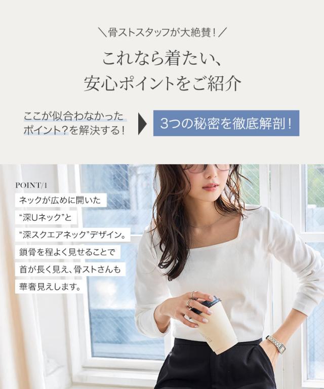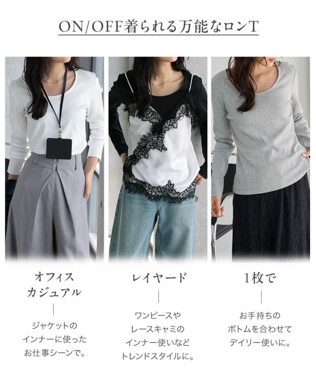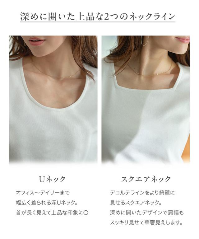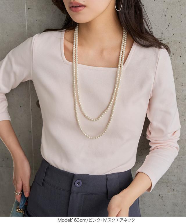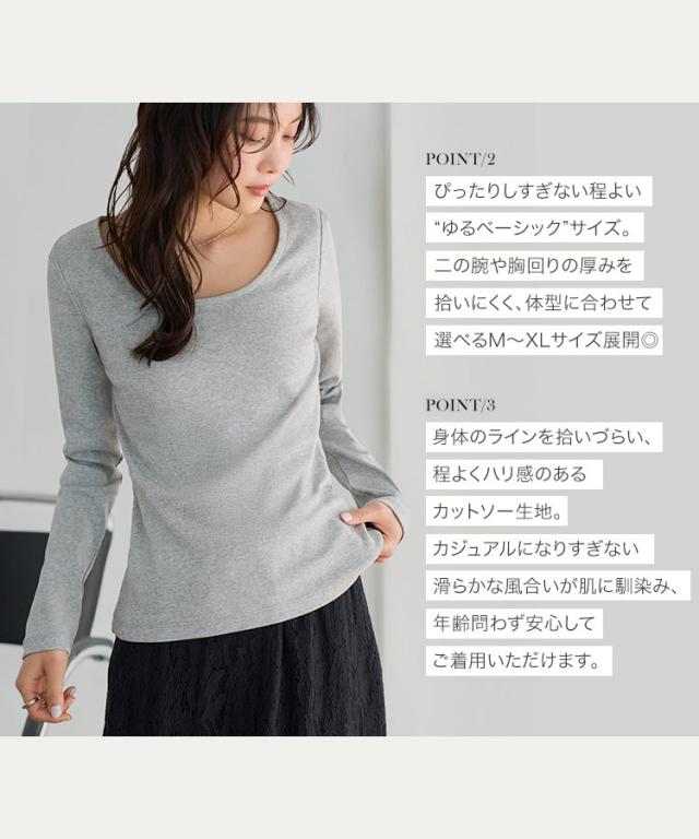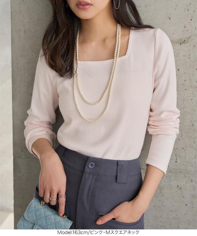 深めに開いたスクエアネック&Uネックが、すっきりとした抜け感を演出する長袖Tシャツ。程よく身体にフィットするシルエットで、インナーとしても一枚着としても幅広く活躍します。M/L/XLの3サイズ展開で、自分に合ったバランスで着こなせるのも嬉しいポイント。デイリーに取り入れやすく、さりげなく女性らしい甘さを添えてくれる一枚です。【素材・サイズ感】全体的に程よくフィットするシルエットで、身体のラインを拾いすぎずすっきり着られます。伸縮性のある生地で快適な着心地ながら、程よいゆとりがありリラックス感も魅力です。スクエアネックはデコルテを美しく見せ、Uネックは柔らかく女性らしい雰囲気をプラス。シンプルなデザインだからこそ、着こなし次第で上品にもカジュアルにも活躍する万能トップスです。※キャンセル/変更不可※※お届けまでの日程について