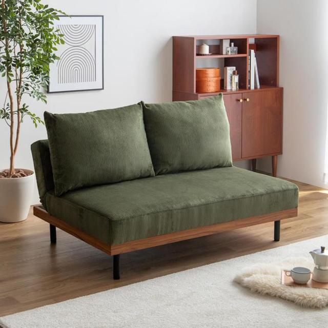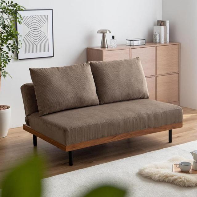 やさしい肌触りのコーデュロイ、温かみのある木目、空間を引き締めるアイアン脚が調和し、置くだけでおしゃれなリビングに。