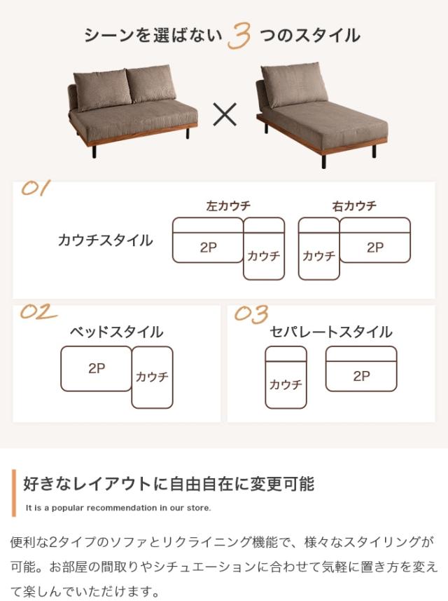 左右どちらでもカウチ配置ができ、レイアウト変更も簡単。
