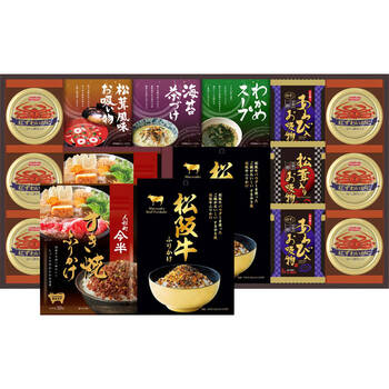 ・松阪牛ふりかけ:各30g×各2、紅ずわいがにほぐし身:55g×6、丸美屋のり茶漬け:2袋、永谷園松茸風味お吸い物:2袋、わかめスープ:3袋×各1、あわび入お吸い物×2、松茸入りお吸い物×1