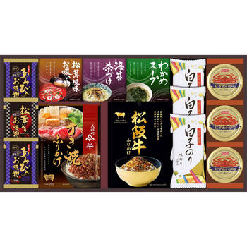 ・松阪牛ふりかけ:各30g×各1、丸美屋のり茶漬け:2袋、永谷園松茸風味お吸い物:2袋、わかめスープ:3袋×各1、あわび入お吸い物×2、松茸入りお吸い物×1、白子のり:8切5枚×3、紅ずわいがにほぐし身55g×3