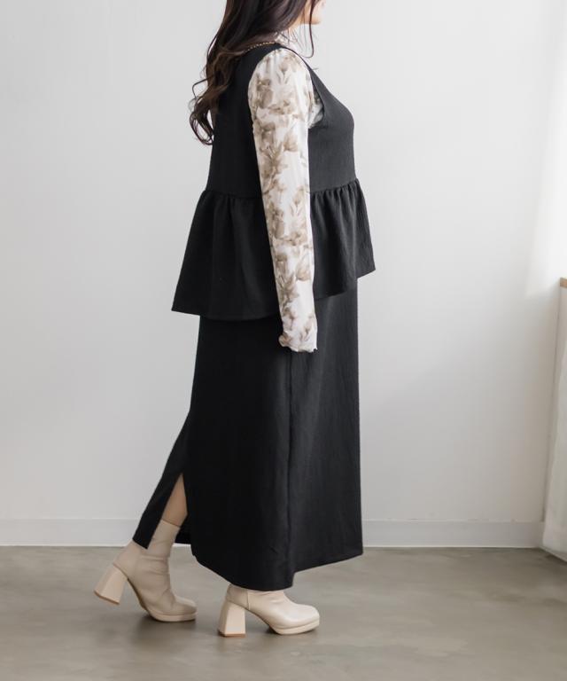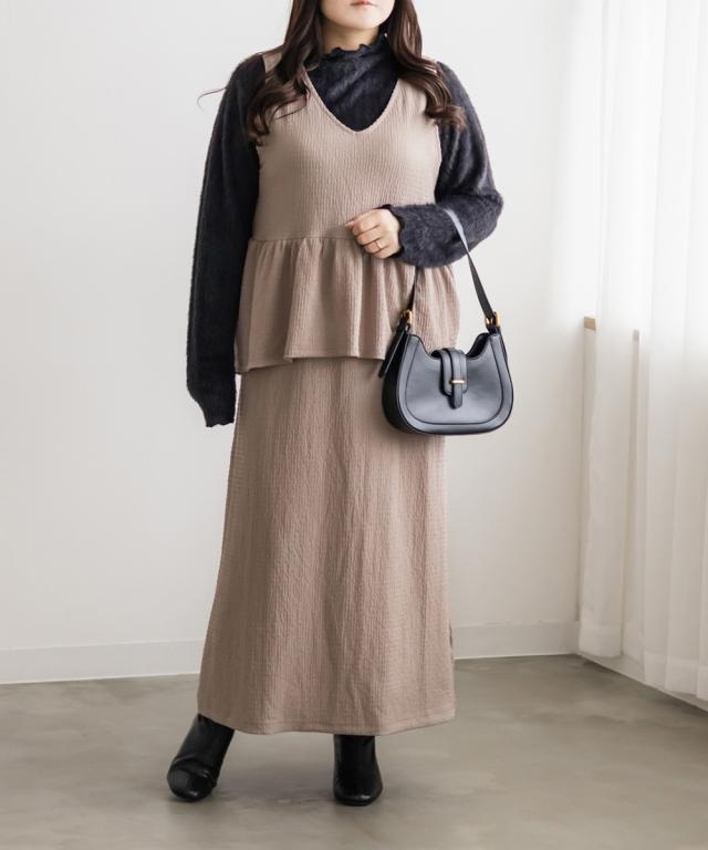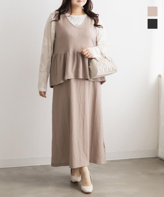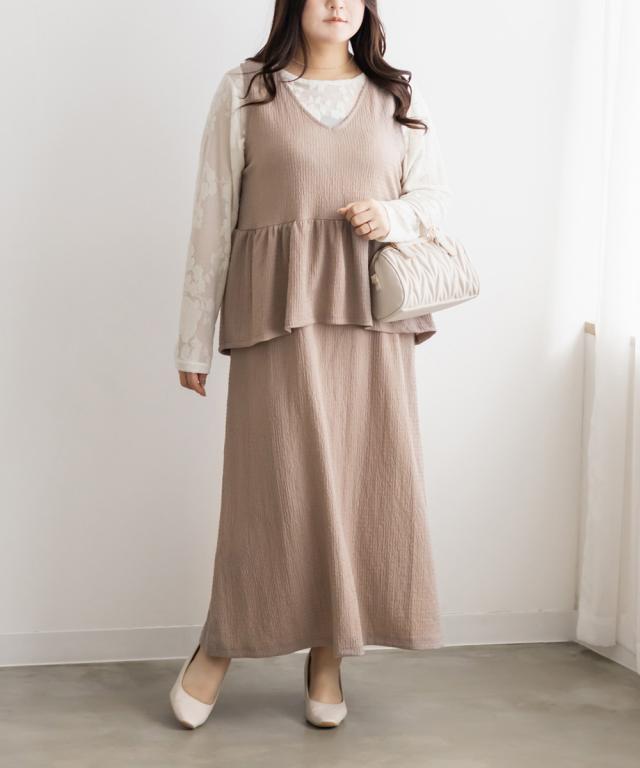 | 3Lサイズを着用して程よくゆとりを持って着られました。伸びる生地なのでらくちんな着心地でした。女性らしさが際立つすっきりとしたIラインのワンピースで、ビスチェを重ね着したようなデザインがかわいいです!華やかさをプラスするペプラム切替が脚長効果をプラスし、腰回りの体型カバーも叶います♪インナー次第でオールシーズン着られるのでたくさん着回したい1枚です◎ |