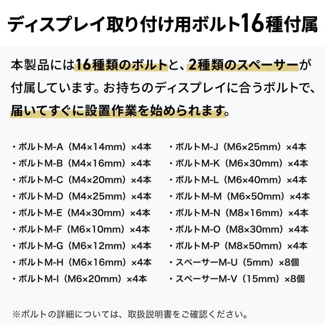 ■付属品:ディスプレイ取り付けネジ(M4×14、M4×16、M4×20、M4×25、M4×30、M6×10、M6×12、M6×16、M6×20、M6×25、M6×30、M6×40、M6×50、M8×16、M8×30、M8×50)各4本、スペーサー5mm×8個、スペーサー15mm×8個