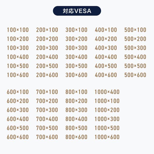 ■対応VESA:100×100、100×200、100×300、100×400、100×500、100×600、200×100、200×200、200×300、200×400、200×500、200×600、300×100、300×200、300×300、300×400、300×500、300×600、400×100、400×200、400×300、400×400、400×500、400×600、500×100、500×200、500×300、500×400、500×500、500×600、600×100、600×200、600×300、600×400、600×500、600×600、700×100、700×200、700×300、700×400、700×500、700×600、800×100、800×200、800×300、800×400、800×500、800×600、1000×100、1000×200、1000×300、1000×400、1000×500、1000×600