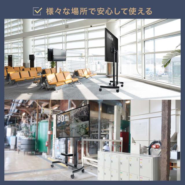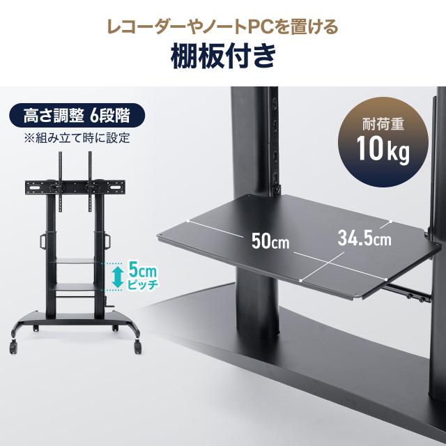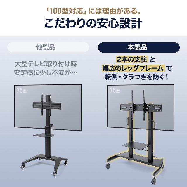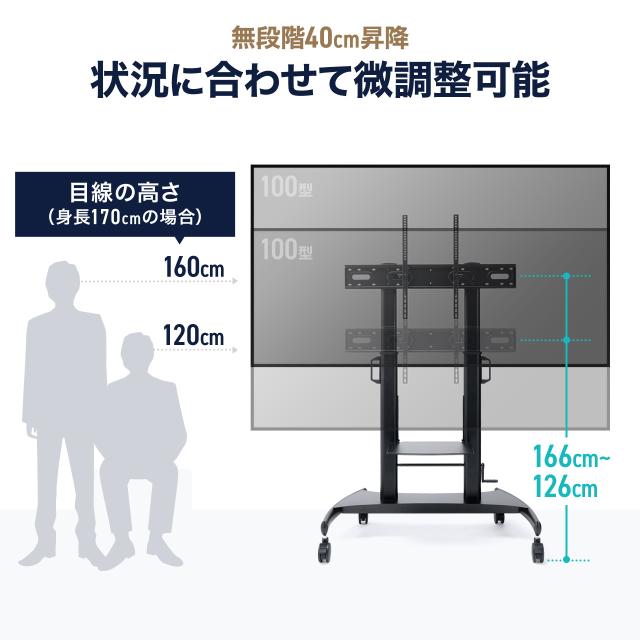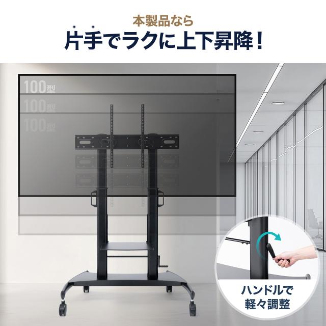 ⇒ご購入の前にご確認下さい60-100インチ対応の大型テレビスタンド。専用ハンドルでディスプレイを付けたまま高さ調整でき、設置後も見やすい位置へ簡単に昇降可能です。最大100kgの高耐荷重&幅広いVESA規格対応。4輪ロック付き大型キャスターで移動も安定し、棚板付きで周辺機器の設置にも便利。【WEB限定商品】